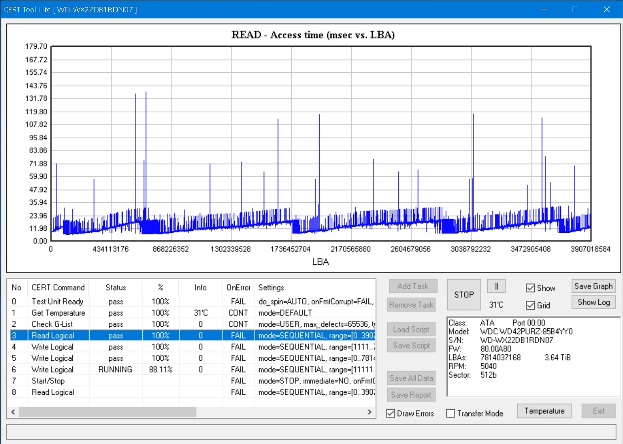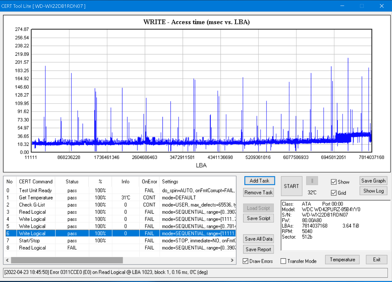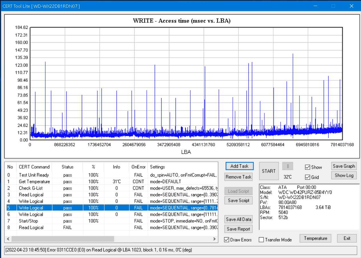 [2021-04-26 23:32:53] Slow run on Write Logical @ LBA 119636480, block 1 -> 155.08 ms