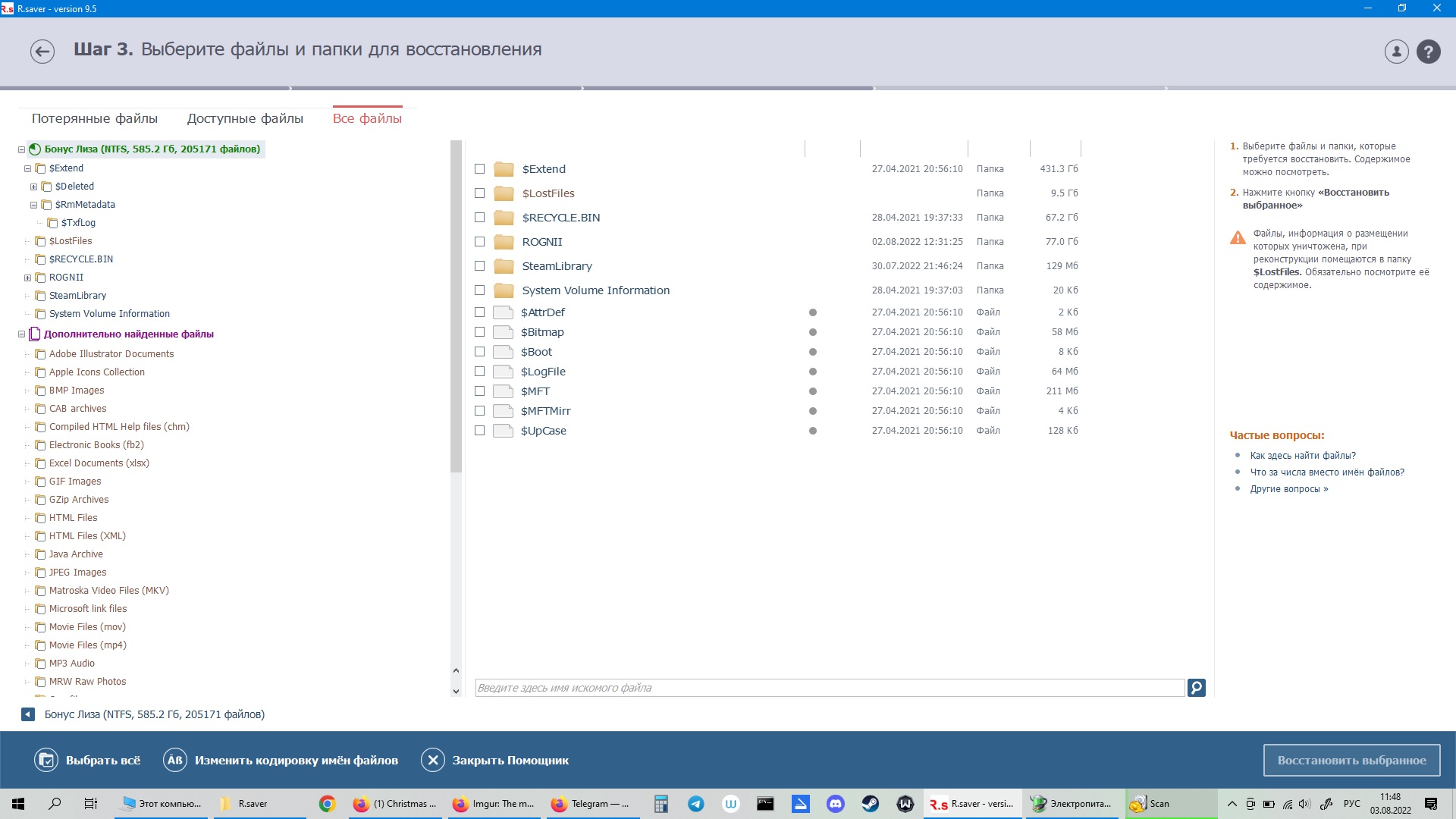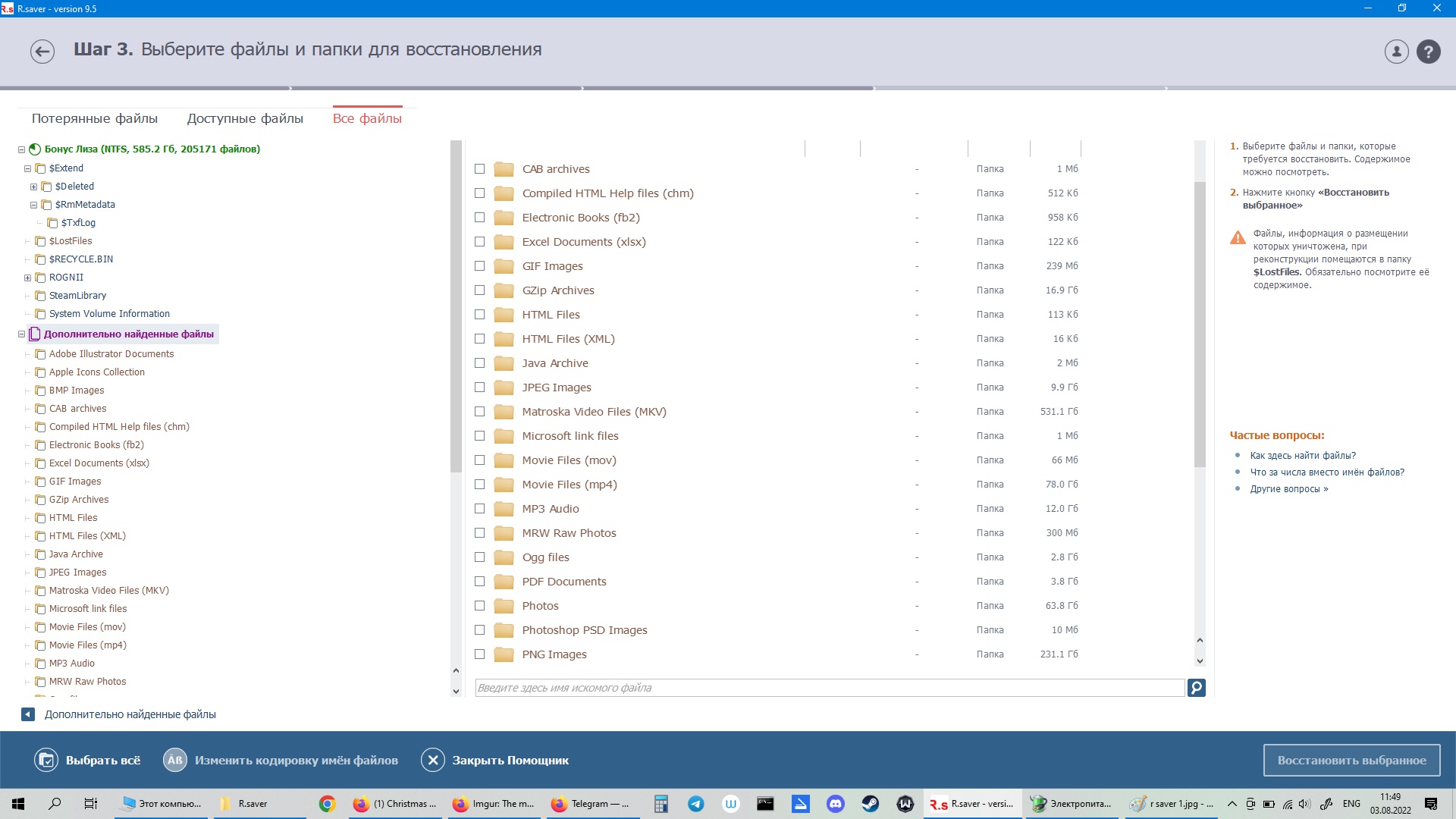 2) В окне слева вверху показывает название диска с объёмом обнаруженных файлов(в нашем случае 585 гб). Есть ещё раздел «Дополнительно найденные файлы», в котором общий объём не показывает, но есть две папки на 500 и на 200 гб. Правильно я пониманию, что 585 гб относятся только к файлам, которые не находятся в Дополнительно найденных файлах?