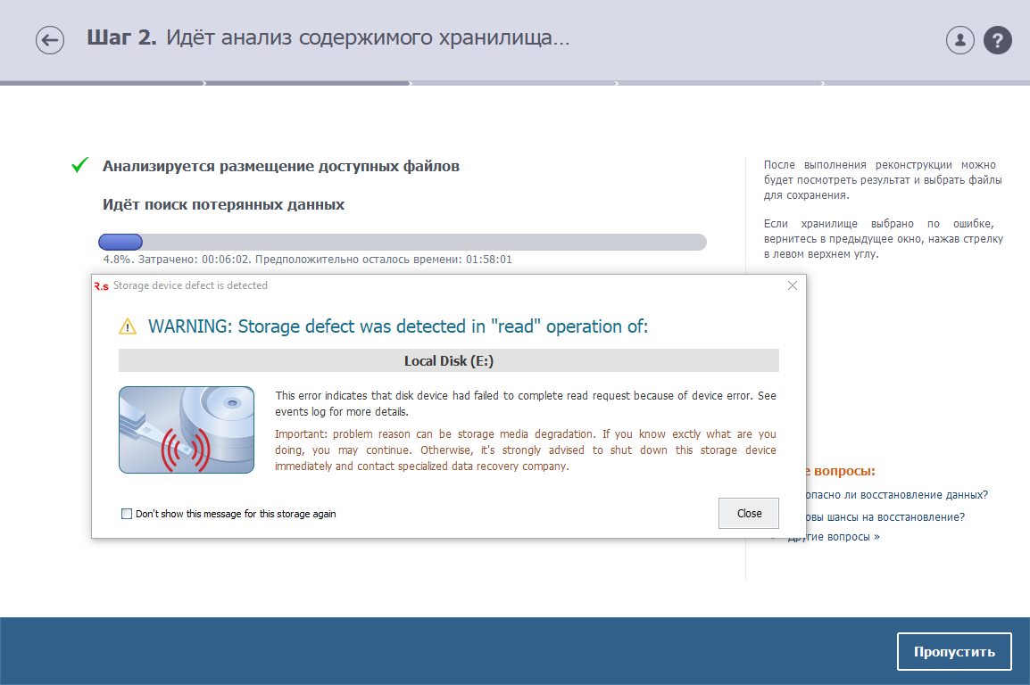 У диска слетела файловая система, стала показывать RAW. Запустил chkdsk E: /f, файловая система восстановилась FAT32, фалов нет. Запустил R.saver он доходит до 4,8%, пишет что не может прочитить данные. Ставлю галку что бы не показывал больше и процесс зависает, дальше не двигается. Как пропустить и прочитать что можно прочитать? Может сначала надо как-то поеметить нечитаемые сектора? Приложил скриншоты ошибки и данные тестирования диска.