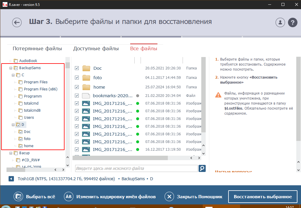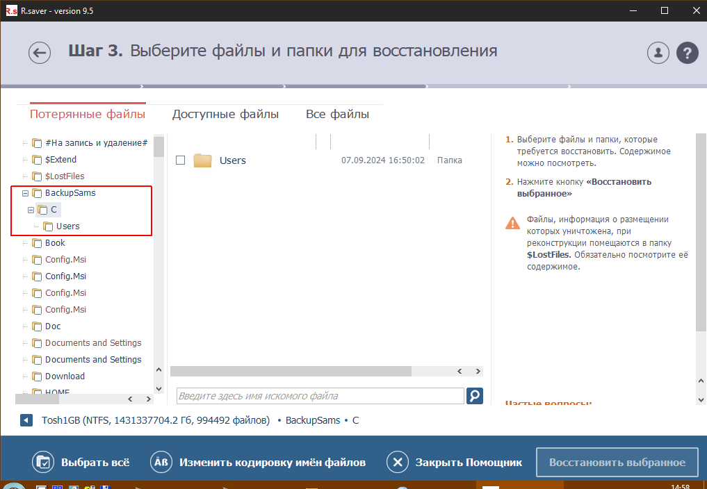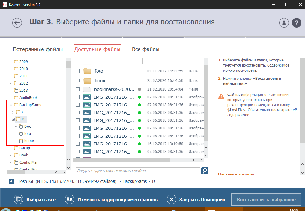 Итак, как пример мне нужно восстановить содержмое каталога BackupSams.