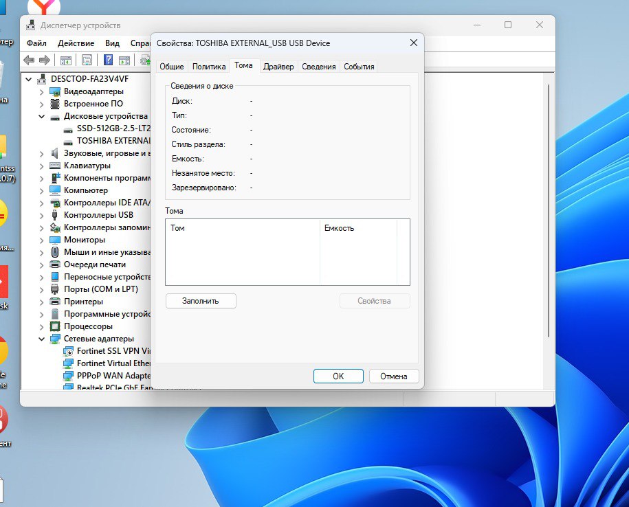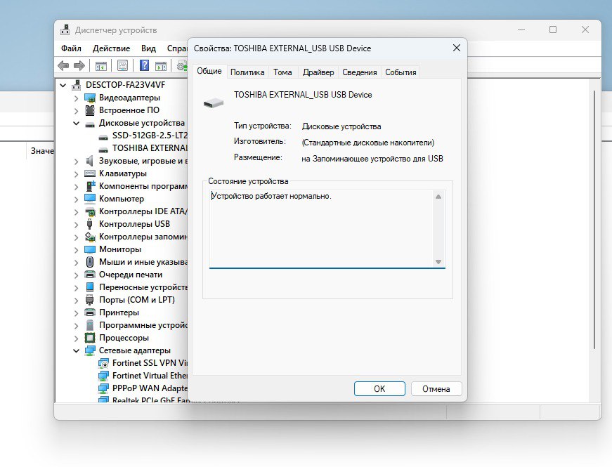 Добрый день, подскажите. Внешний жесткий диск "Toshiba', не определяется через "Этот компьютер" , светодиод моргает , так вроде бы крутится , по звуку все тихо, через какое то время перезагружается ПК и пока не вытащу из разъёма не запускается снова . Данный диск вижу только через "Диспетчер устройств".