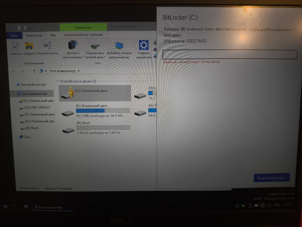 Добрый день Столкнулся с проблемой, при включении ноутбука dell всплыло окно требующие ввода ключа Bitlocker Самостоятельно такую защиту на диск не устанавливал Никакие изменения в конфигурации и настроек Биоса не совершал После попытки понять причину нашел только отсутствие прописанного service tag в bios Возможно ли восстановить данные с зашифрованного диска? Могло ли произойти зашифрование из-за слеоевшего service tag? Если да, то восстановив service tag, диск не будет запрашивать ключ bitlocker?